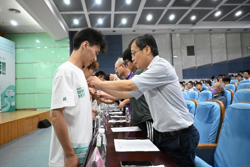 学院副院长谢春晓主持了了仪式并介绍了出席的领导和嘉宾。仪式在庄严的国歌声中拉开帷幕。陈伟院长首先介绍了东莞的产业优势与学院办学特色,鼓励新生以优秀学长学姐为榜样,勇于创新,敢于追求,成为一名全新的更优秀的自己。随后,学院领导为新生代表佩戴院徽,象征着2025级新生正式成为"粤台人"。