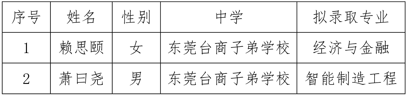 根据教育部有关文件和《东莞理工学院2021年依据台湾地区大学入学考试学科能力测试成绩招收台湾地区高中毕业生招生简章》等文件精神,经过报名审核、评委面试,现将拟录取名单和拟录取专业予以公示,公示期为2021年6月4日- 6月24日。若对成绩有疑问者,请于公示期内提出,过期不再受理。