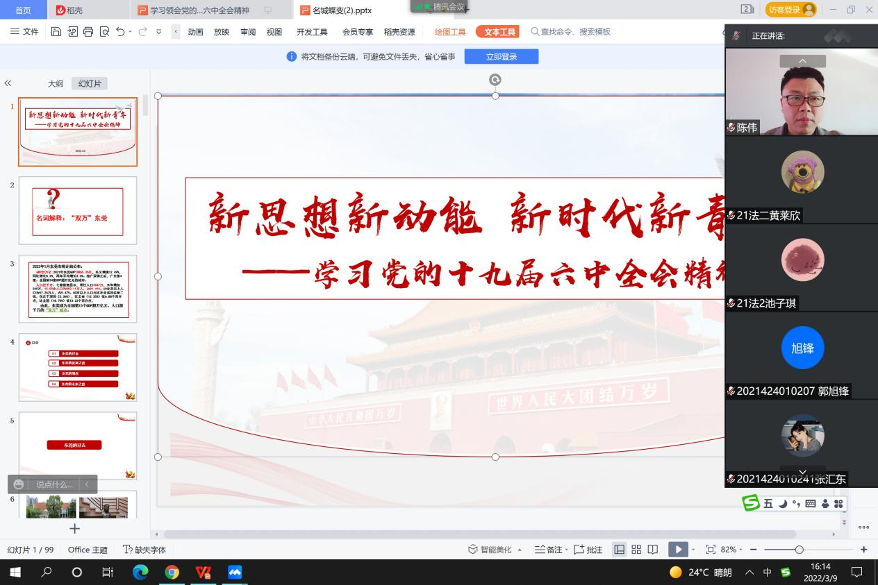 为深入学习贯彻党的十九届六中全会精神,进一步深化拓展党史学习教育,3月9日,yl6809永利检测中心院长陈伟于线上为21级法社1班、2班,21级社工1班、2班学生上思政课。
