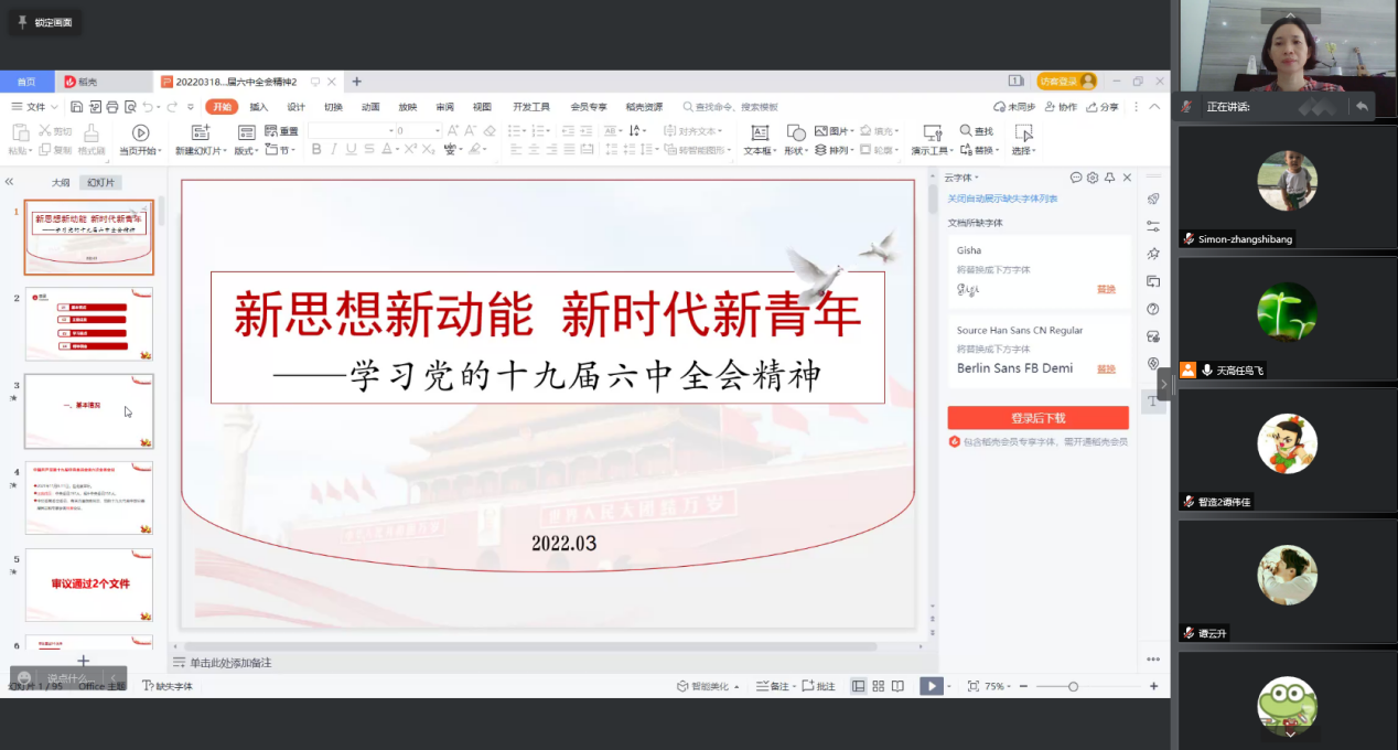 3月18日,yl6809永利检测中心书记宋美娴以“新思想新动能 新时代新青年”为主题,于线上为2021级智能制造工程系、2021级经济与金融系的同学们讲授了新学期“思政第一课”。