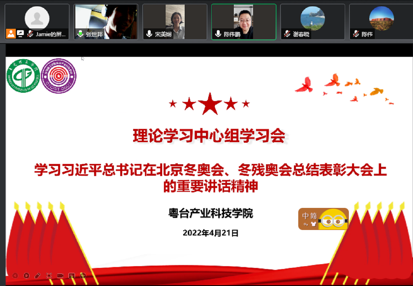 4月21日,书记宋美娴主持召开粤台学院理论学习中心组学习会,领学了习近平总书记在北京冬奥会、冬残奥会总结表彰大会上的重要讲话精神。院长陈伟、副书记谢春晓以及中心组成员参加会议。因疫情防控要求,学习会以线上形式进行。