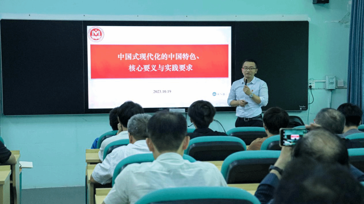 专题辅导会上,毛安翼从中国式现代化的“中国特色、核心要义、实践要求”三个方面展开具体讲解。同时结合了《中国式现代化面对面》的内容,深入浅出地阐述了中国式现代化的重要意义和发展路径,引导全体教职工深入思考和研究中国式现代化的内涵和要义,进一步加深了教职工对中国式现代化的理解和认识。他指出,中国式现代化的核心要义是实现国家富强、民族振兴、人民幸福。这一核心要义体现了中国共产党始终把人民利益放在首位的执政理念,强调以人民为中心的发展思想,坚持人民主体地位,推动人的全面发展和全体人民共同富裕。中国式现代化的实践要求是坚持中国特色社会主义道路,推动经济社会发展的全面进步。