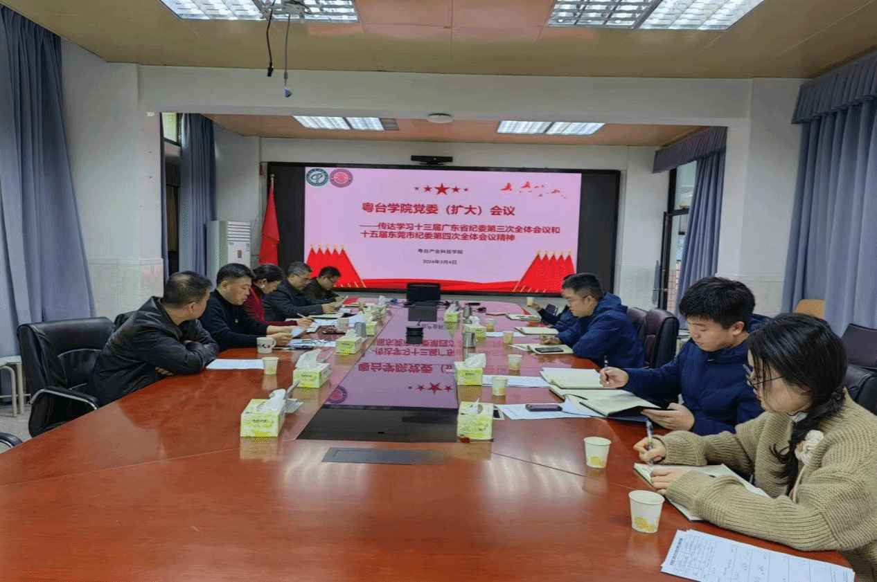 3月4日,粤台产业科技学院在莞城校区实验楼302会议室召开了党委(扩大)会议,传达中共中央学习贯彻习近平新时代中国特色社会主义思想主题教育总结会议精神和习近平总书记在中央政治局第十一次集体学习时的重要讲话精神。传达了十三届省纪委第三次全体会议和十五届市纪委第四次全体会议精神,研究贯彻落实意见。学院中层领导干部、党委委员、支部书记等参加了会议。会议由党委书记宋美娴主持。