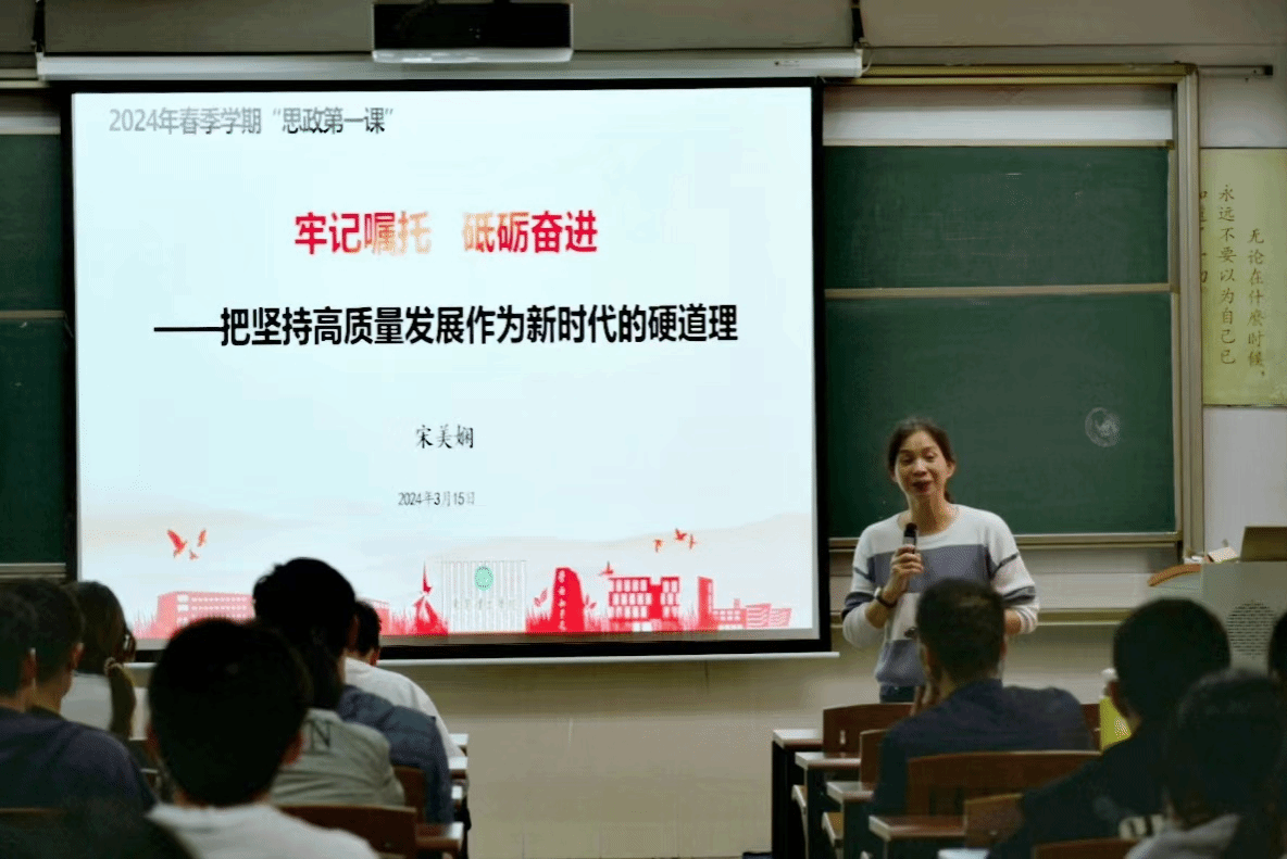 为深入学习贯彻习近平新时代中国特色社会主义思想,学习宣传习近平文化思想、习近平总书记视察广东重要讲话及重要指示精神。3月15日,yl6809永利检测中心党委书记宋美娴在莞城校区六号楼405教室为2023级计技设计1班和2023级经济与金融1、2班共88名学生讲授了以《牢记嘱托 砥砺奋进——把坚持高质量发展作为新时代的硬道理》为题的“思政第一课”。