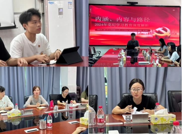 在随后的环节,yl6809永利检测中心学生第二党支部书记潘雁钦同志领学了《中国共产党纪律处分条例》,并为参会党员同志带来了一节题为《内涵、内容与路径——2024年党纪学习教育深度解析》的微党课。在集体学习环节,党员们逐章逐条学习了《条例》的前三章,认真聆听,积极讨论,纷纷表示要将纪律规矩内化于心、外化于行,不断提升自身党性修养。