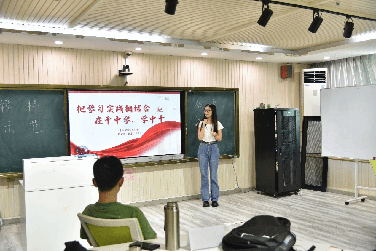 学院邀请了三位优秀学生党员依次进行分享交流。其中,正式党员张子怡以“学习与实践相结合,在干中学、学中干”为主题,结合自身在学生工作、志愿活动和参加各项竞赛等方面的成长经历进行分享。她鼓励大家要多向身边优秀的同学学习,做到经常自我反思,善于总结,结合瞬息万变的各种情况不断提升自我,做到知行合一。预备党员沈佳明以入党动机为切入点,提出要坚持学习,努力做终身学习型人才,同时,鼓励大家要加强理论修养,主动投身社会实践,争取在思想上和行动上共同入党。预备党员陈雅文,结合自身实际,畅谈自己在理论知识学习与参加各项实践活动期间的体会与感悟。她鼓励同学们要开拓思维,用于创新,为实现中华民族伟大复兴的中国梦奉献自己一份青春力量。
