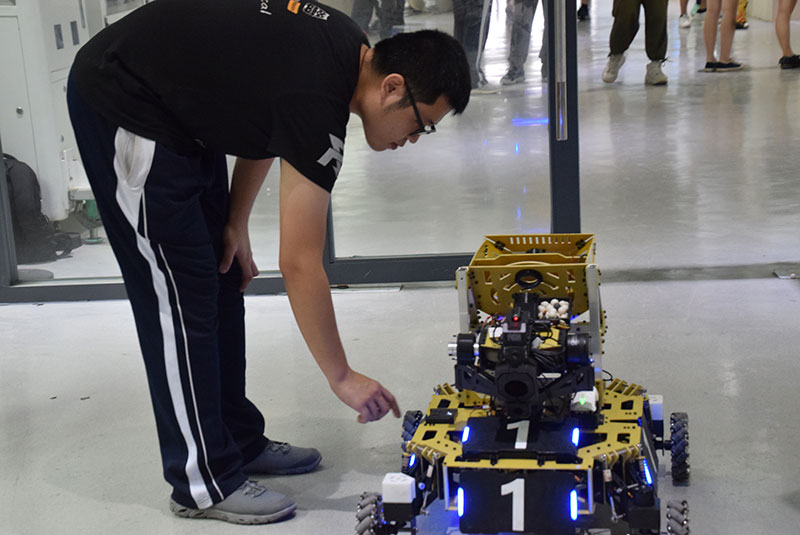 智能制造学群重点展示了“Kinetic Robotics”机器人战队,其成员分布两个校区,非粤台学院学生占比约50%,现场演绎了RoboMaster国际大赛机器人组合的场面。还展示了具有多重复杂组合构建的智能避障小车、指尖陀螺、十二兽首仿真模型、步行机器人等产品。