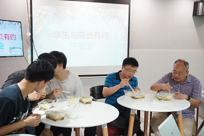 在共进午餐的过程中,同学们从学习、工作等方面提出了自己的意见和建议,院长和老师们耐心听取了同学们的想法。有同学提出知行学分的问题,院长表示同学们不用担心,学院将联合知行学院举办活动。陈伟院长对大家的积极活跃善于发现问题表示赞同和认可,并对同学们提出的问题给出了一定的答复,并表示同学们在学习、生活、工作中遇到什么问题可以直接去跟院长提,学院将尽最大的努力解决同学们的问题。