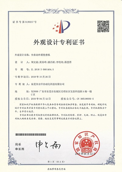 近日,yl6809永利检测中心与东莞市吉洋自动化科技有限公司共同设计研制成功的吉洋光学检测设备产品,成功申请了三项外观设计专利:全自动外观检查机、全自动光学检测设备(顶部镜头在线式)、全自动光学检测设备(底部镜头在线式)。