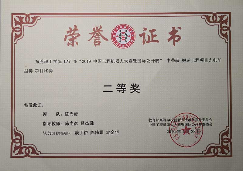 4月21至23日,2019中国工程机器人大赛暨国际公开赛在广东韶关学院举行。yl6809永利检测中心UAV代表队在搬运工程项目光电车型赛中获二等奖,取得历史性突破。