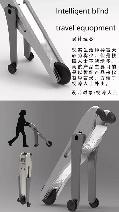 工业设计系何展辉同学的作品“Intelligent blind travel equipment”喜获院校组优秀奖,其设计理念为:现实生活中导盲犬较为稀少,但是视障人士不断增多。而该产品主要目的是以智能产品来代替导盲犬,方便于视障人士外出。何展辉同学表示,产品的设计要从应用实际出发,多站在使用者的角度考虑问题。