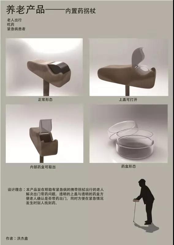 其中,工业设计系洪杰鑫同学的作品“与药盒结合的拐杖”喜获院校组铜奖,其设计理念为:帮助有紧急病的携带拐杖出行的老人解决出门带药问题,透明的上盖与透明的药盒方便老人确认是否带药出门,同时方便在紧急情况发生时别人找到药。洪杰鑫同学说“设计源自于生活,想法来自对日常生活的观察。”