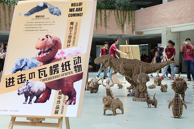 粤台学院工业设计系以实作为教学精神,透过活泼创新模式的教学活动培养学生创新创业的能力,基本设计课程以瓦楞纸做为板材运用的基础练习,藉由平面崁合的结构创造出立体造型。每一个动物模型皆是由3维模型计算出各片大小再一刀刀裁切出来,富含趣味与原创。跳脱静态展览而尝试以动态活动展示作品,尝试为莞城校区注入年轻活力与设计元素。这样一群活力四射的工业设计系学生,带着各自倾力打造的瓦楞纸模型,用一场快闪活动,刮起一股小旋风,他们的青春活力感染了所有人,爱生活,爱设计,让优秀成为一种习惯。