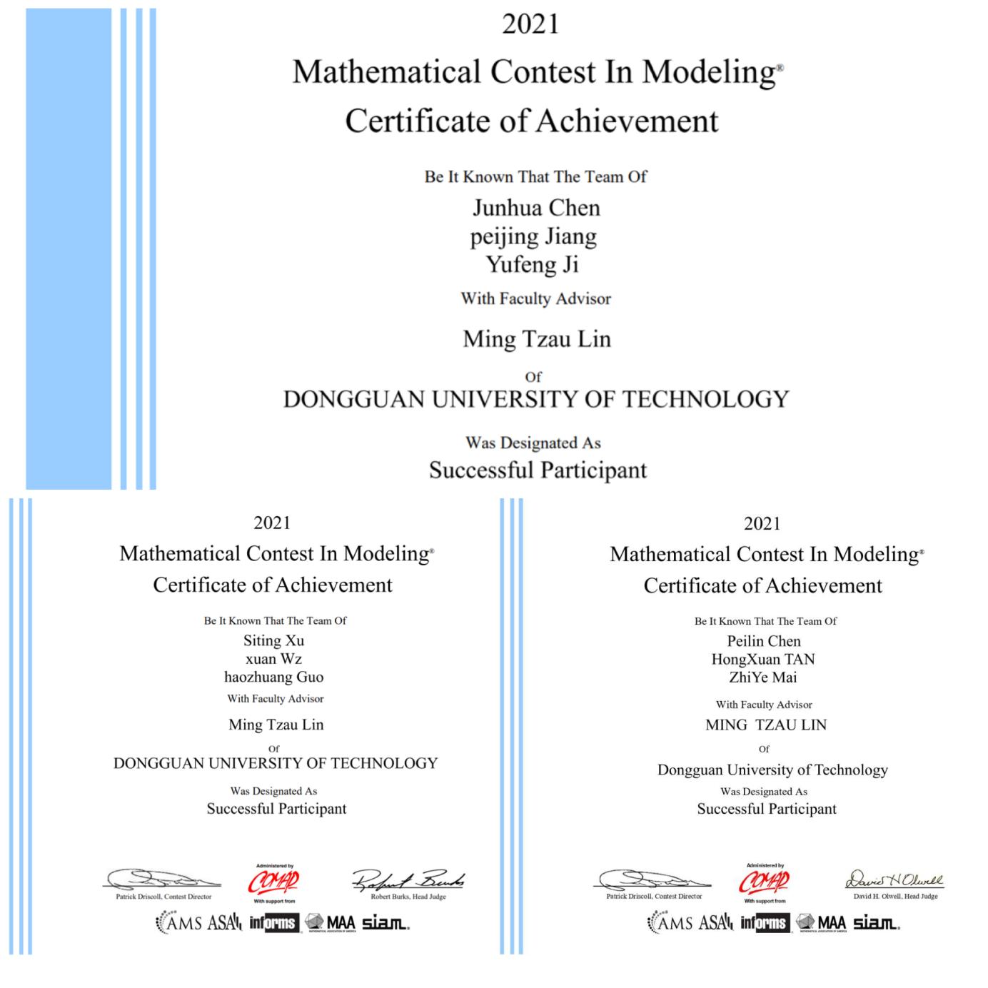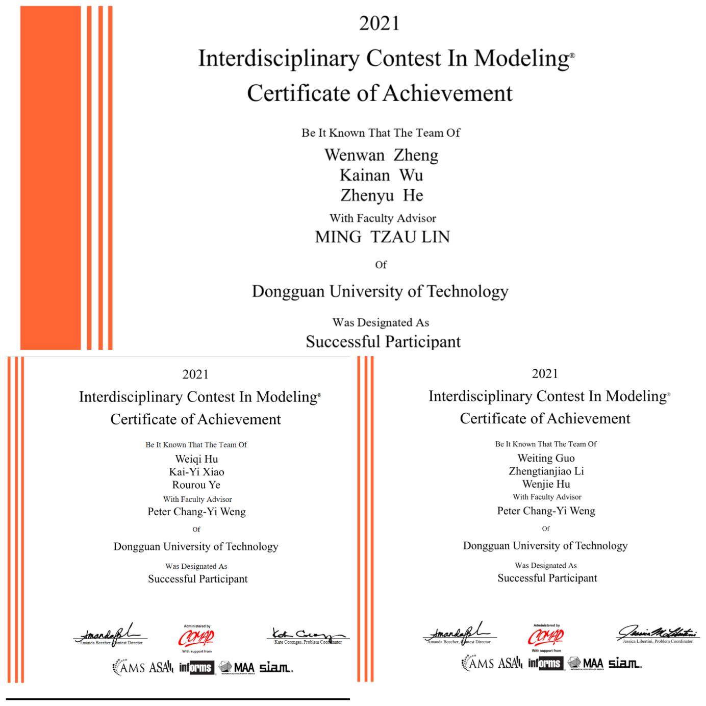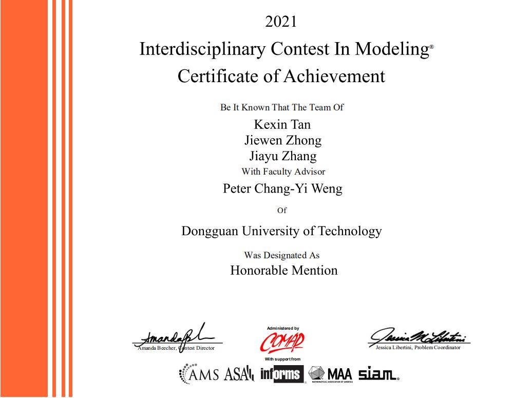 近日,2021年美国大学生数学建模竞赛(MCM/ICM)成绩公布。yl6809永利检测中心共有7支队伍参赛并获奖,包括1支队伍获Honorable Mention(二等奖),其余6支队伍获Successful Participant(三等奖)。