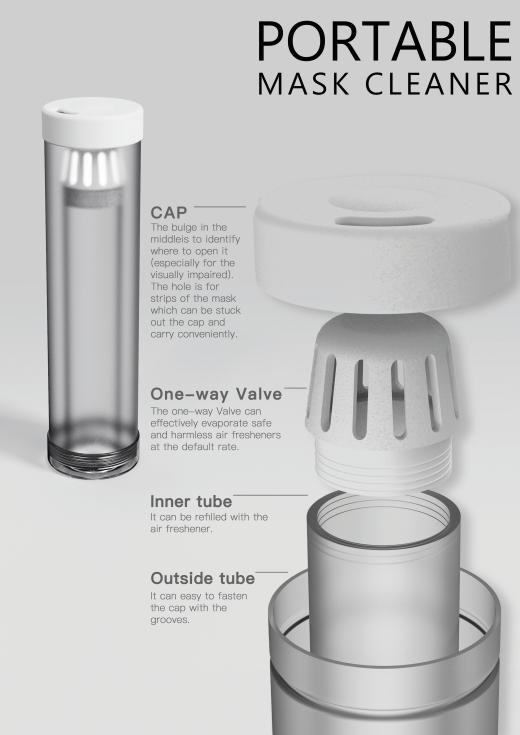 《PORTABLE MASK CLEANER》由马居正、陈维钟老师指导完成。该组同学表示口罩收纳盒的设计,是在新冠疫情的背景下产生的,代表着该组对口罩收纳的思考,口罩已经逐渐成了我们日常出行的必备品,伴随着的,我们也面临着口罩收纳及除臭的问题,在设计过程中,他们通过二氧化氯对口罩进行除臭,简单的操作方式为了给予用户更好的使用体验,该组同学表示想通过设计寻找问题的最优解,创造全新的便携的口罩收纳及除臭方式。