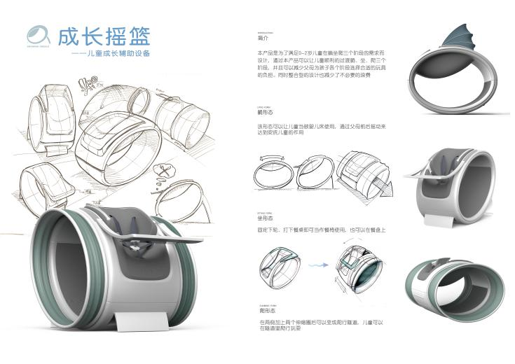 《成长摇篮》由何孝元老师指导完成。该组同学表示他们的设计主要集中在儿童0~2岁。儿童在0~2岁的时候器官发育有较大的飞跃,其中经历的“躺、坐、爬“这三个阶段是儿童学会走路以及协调身体各项能力的基础。因此他们对这三个阶段的市场产品进行调研,赋予产品圆润的外形,结合三者的机能,设计出”躺、坐、爬“一体化儿童辅助型产品,减少父母为孩子各个阶段选择此类产品的负担,同时整合型设计也减少了不必要的浪费。
