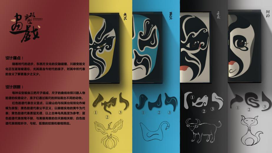 《画戏-云型板》由张鸿兪老师指导完成。该组同学表示这是一款供儿童娱乐用的云型画尺。以画戏为题,将川剧的变脸与云型画尺结合,运用川剧的五种基本脸谱颜色,红、黑、黄、蓝、白中所对应的不同性格,来依照动物意象匹配性格进行设计。